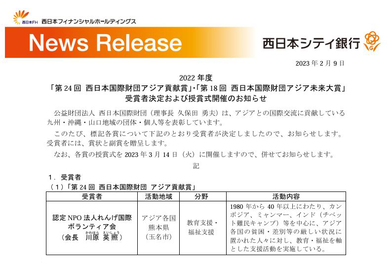 第24回 西日本国際財団アジア貢献賞を受賞しました