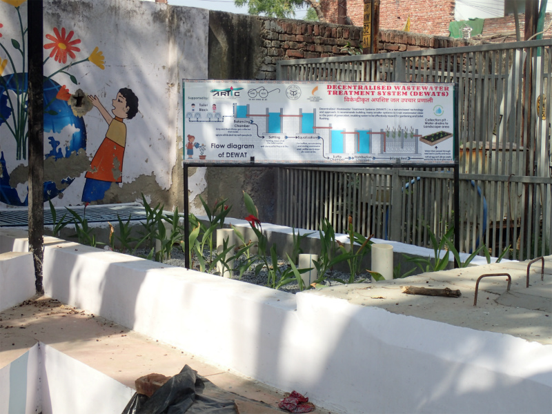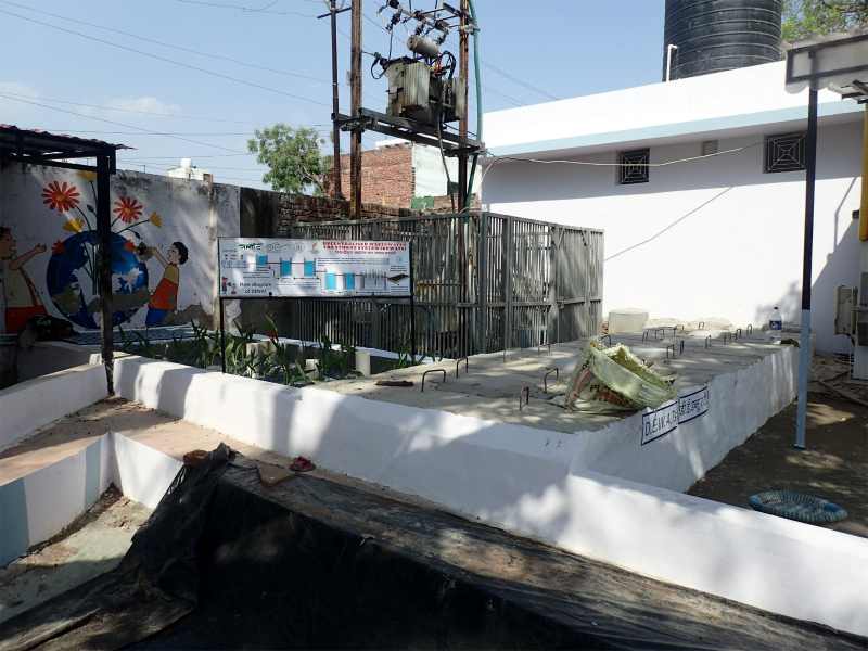 インドは水不足問題は大変深刻で、貧困地域はより大きな影響を受けています。地下水自体の不足をはじめ、下水道の未整備により汚水が停滞し蚊が発生します。これが原因でマラリヤやデング熱などの被害がでています。また、地面に垂れ流しの汚水は地下に浸透し、限りある地下水を汚染しています。この汚染水を飲むことでの健康被害も報告されています。このような状況を改善するため、トイレから流れ出る汚染水を浄化し再利用する浄化槽を設置しました。浄化槽で浄化された水は経路を伝ってガーデニング用水として植物を育てるために使用されています。